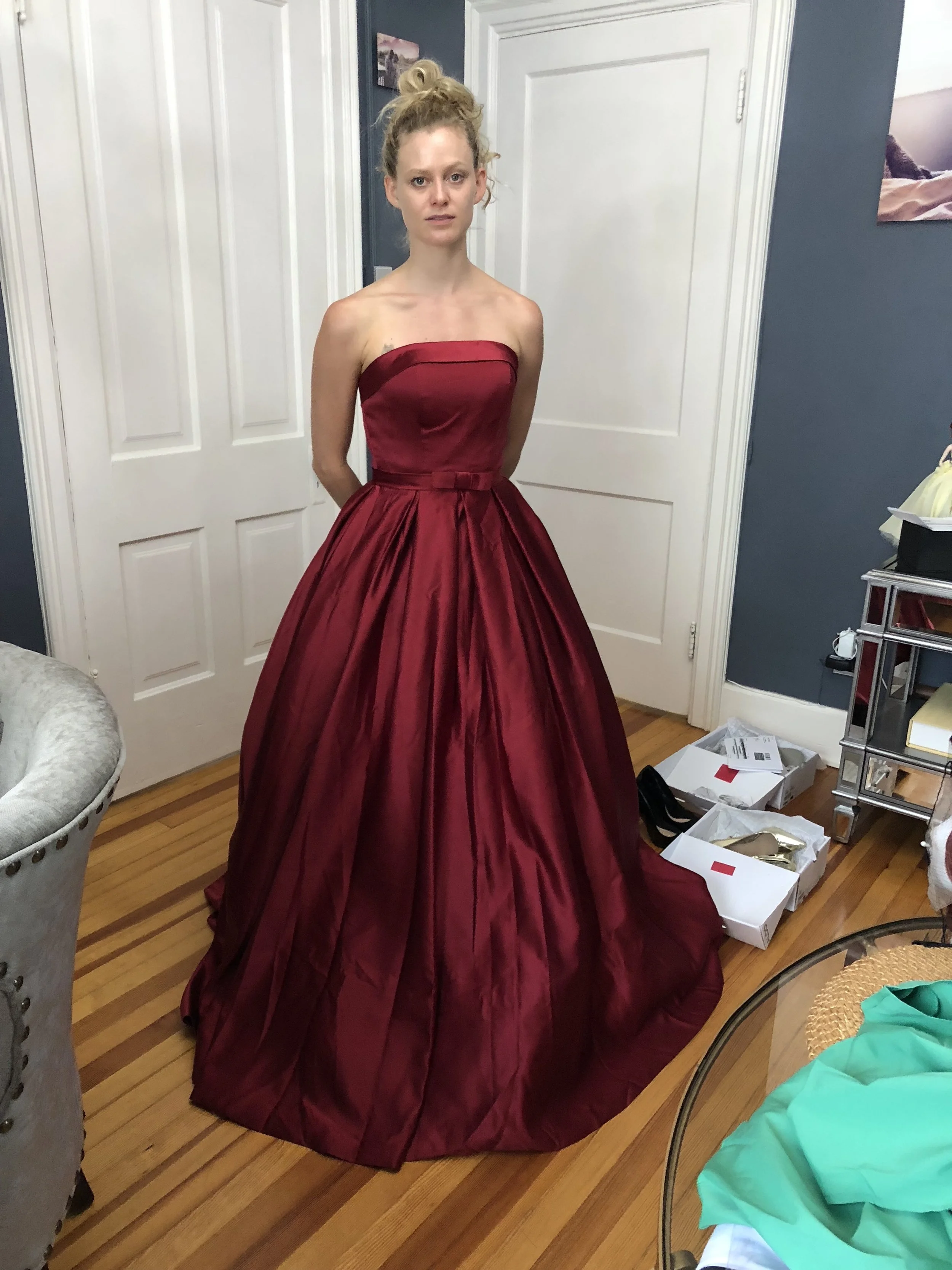 Maggie in a Denver fitting. Thank you, Facebook followers…the red looked amazing!!!